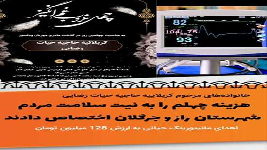 خانواده‌های مرحومه کربلاییه حاجیه حیات رضایی (کمالی)به جای برگزاری مراسم چهلم، هزینه آن را صرف خرید یک دستگاه مانیتورینگ علائم حیاتی به ارزش ۱۲۸ میلیون تومان کرده و این تجهیز را به درمانگاه شهرستان راز و جرگلان اهدا کردند.